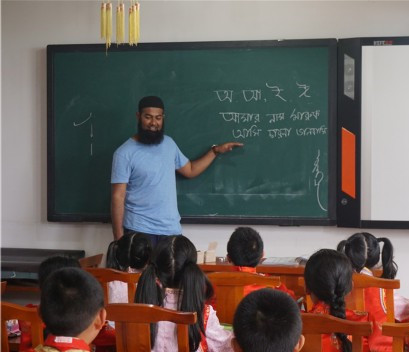 孟加拉留学生海山在给中国学生上课时,用孟加拉语写下“我爱中国,我爱孟加拉” 摄影:渠鸿儒