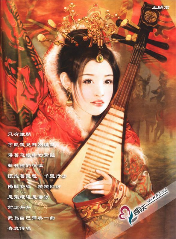 According to legend, Wang felt sad while leaving her homeland. She played melancholic music on the qin, a stringed instrument, while riding a horse. A flock of geese, flying overhead, forgot how to fly—after seeing the beautiful, but distraught, woman playing the sad music—and plummeted to the ground.