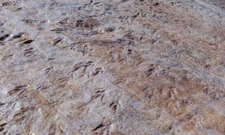 Photo taken on Aug. 9, 2010 shows the dinosaur footprint fossil group in the Huanglonggou area of Huanghua Township in Zhucheng City, east China's Shandong Province. The dinosaur footprint fossil group, which formed in the middle of the Cretaceous period, is located in the Beiling hillside, 20 kilometers away from the urban area of Zhucheng. It covers an area of 2,600 square meters and contains some 3,000 footprint fossils of more than six kinds of dinosaurs. The length of smallest fossil is about 10 centimeters, while the largest one is about 40 centimeters.