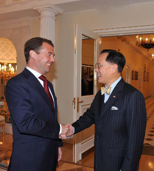 Russian President Dmitry Medvedev (L) meets with Donald Tsang Yam-Kuen, chief executive of China's Hong Kong Special Administrative Region, in Moscow, capital of Russia, Aug. 31, 2010.