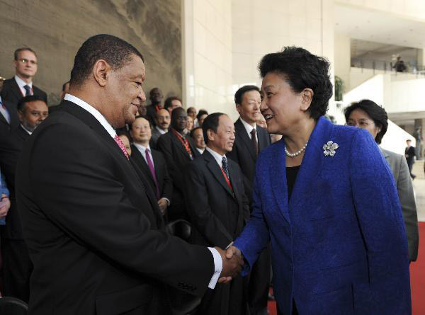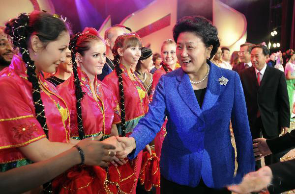 Chinese State Councilor Liu Yandong shakes hands with overseas students after a performance in Beijing, capital of China, Sept. 29, 2010, to celebrate the 60th anniversary of New China's hosting of overseas students.