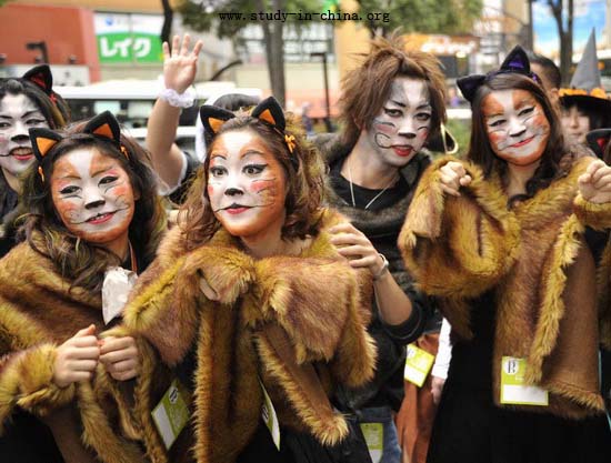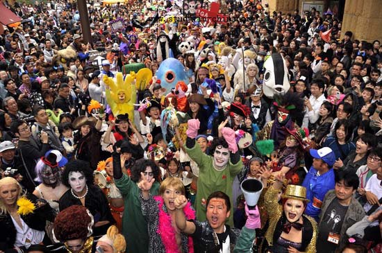 People wearing Halloween costumes march on the street during the 15th Halloween Parade in Kawasaki, suburban Tokyo on October 30, 2011. Some 3,000 dressed up participants join the annual fancy parade