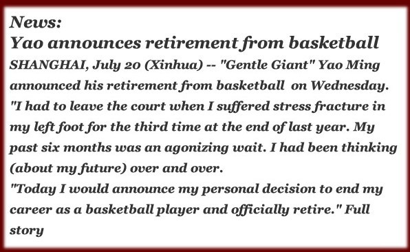 Yao's retirement was highly expected after American media reported on July 9 that the Rockets center had planned to quit.