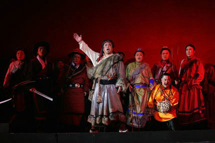 Tibetan and Han people fight side by side; harmony of different cultures is a major theme of the opera. There's also a love story.