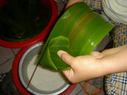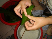 First, clean the sticky rice with clear water and soak it with 60 water for 5 hours, or steep it in cold water for 12 hours. Soak the wrapping material (it can be indocamalus leaves, or the leaves of bamboo, reed, lotus etc) in cold water for 12 hours. After all the preliminary jobs have been done, you can start to wrap the rice. First of all, take two well-soaked indocamalus leaves, and fold them into a funnel with one end longer than the other.