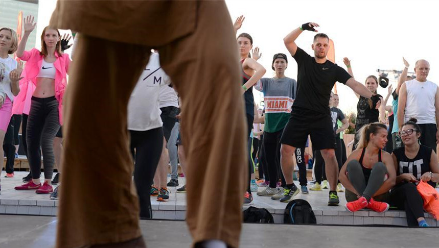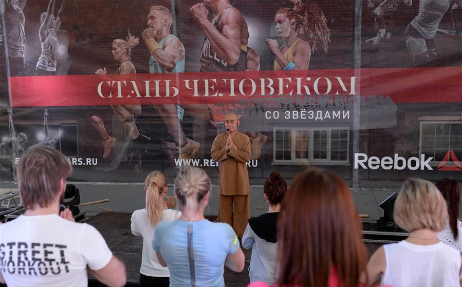 Shaolin monk Shi Yanbin (C) performs tai chi during a tai chi master class at the "Become a human" event in Moscow, Russia, June 15, 2016. A Tai Chi class of Shi yanbin, a Wushu master of the Russian Shaolin Martial Arts Learning Center, was held here on Wednesday.