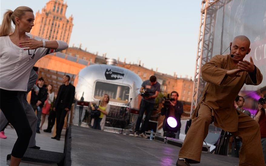 Shaolin monk Shi Yanbin (R) performs tai chi during a tai chi master class at the "Become a human" event in Moscow, Russia, June 15, 2016. A Tai Chi class of Shi yanbin, a Wushu master of the Russian Shaolin Martial Arts Learning Center, was held here on Wednesday.