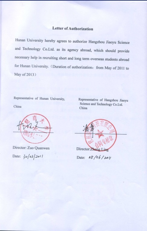 Authorization Letter of Hunan University