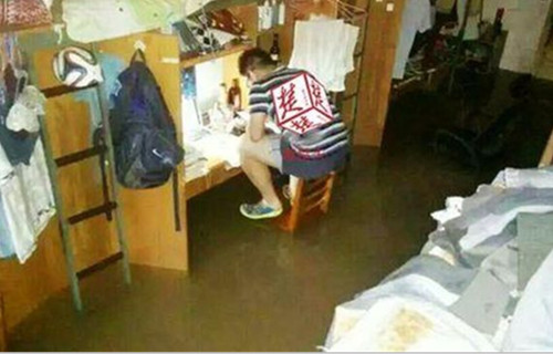 A picture of a student from Wuhan University of Technology in the city of Wuhan apparently studying hard at his desk surrounded by murky flood water has surfaced on Chinese micro-blogging site Weibo.