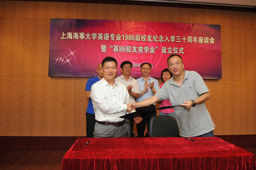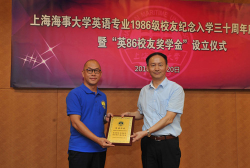 The students who graduated in 1986 came back to the Shanghai Maritime University to congratulate 30 aniversaries for admission with their beloved teachers and students and donated one million for the encouragement fund to Foreign Language School on August, 21st. The secretary of the party committee and some principals of the Foreign Language School attended the activity.