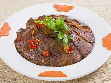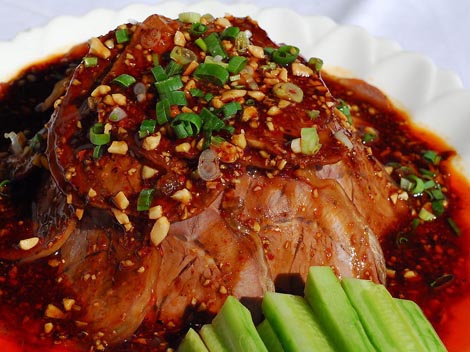 Other unusual items such as beef tongue and beef tripe can also be prepared in the fashion of Five Spice Beef. For successful dishes with these items, first boil the meat in hot water (with wine and ginger root) until almost tender. Then cook it in a soy-based liquid with some or all of these items: star anise, a stick or two of cinnamon, diced orange peel, sugar (preferably brown rock sugar), ginger root, garlic, and chili bean paste until flavorful.