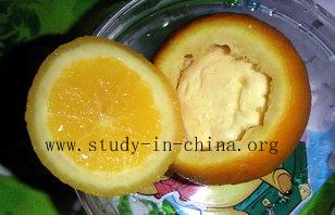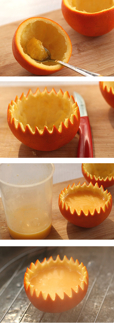 5.The filtered egg liquid with orange juice into the empty orange peel,the top past of orange peel covered with lid.