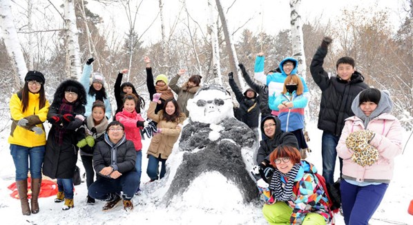People dance ‘Gangnam style’ in front of a snowman that looks like “Psy” in Changchun on Nov.14 2012. The snow brought a lot of fun for residents in Changchun.