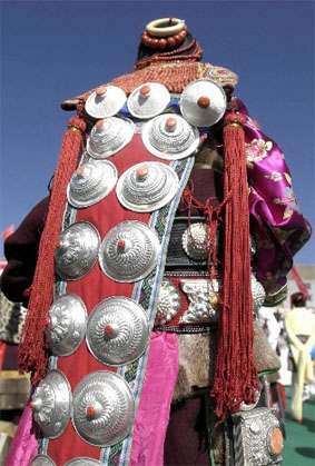 Her bazhu headdress is complemented with silver coins that spangle her braids.. She also wears big earrings, layers of necklaces, rings and strings of coins over her shoulders and at the waist, along with a belt of engraved silver, jade and coral ornaments with a bronze fastening.