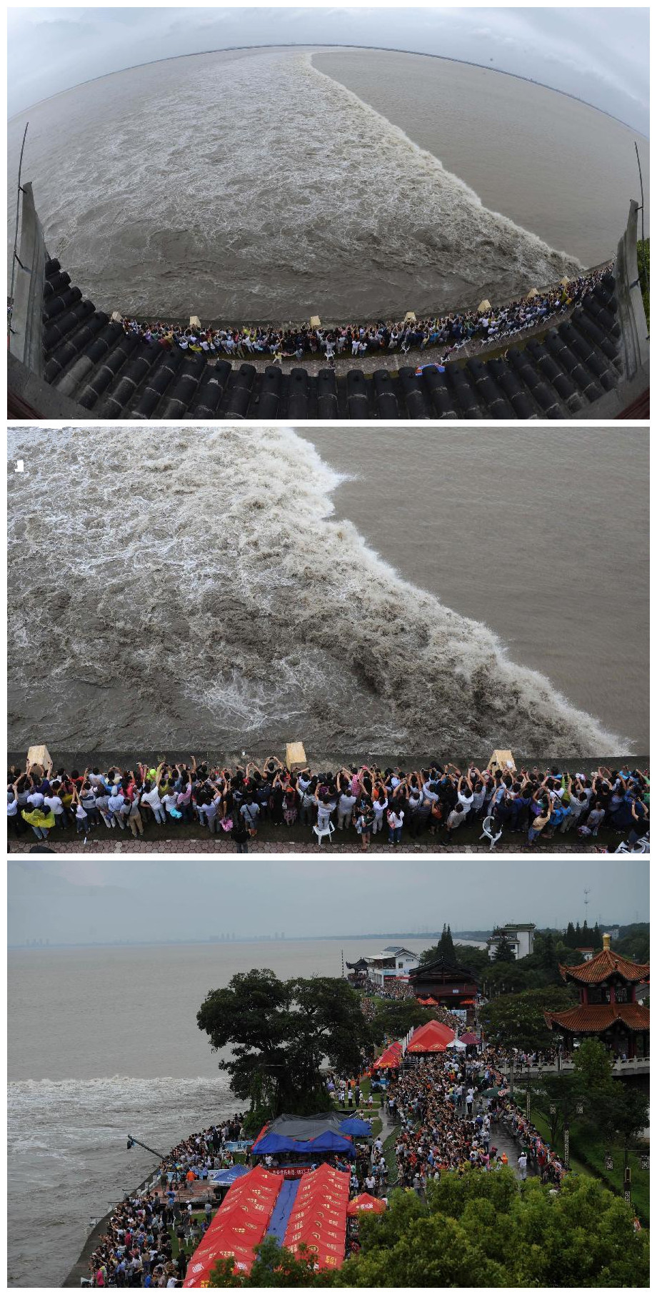The Qiantang River tides appear each year during the eighth month of the lunar calendar, when incoming tides form a huge wave that travels against the direction of the current as the river narrows. A long tidal wave first appears at the wide mouth of the estuary during the late hours of morning, and slowly works its way up river over several hours. The largest waves this year are expected on Friday.