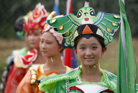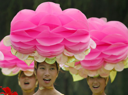 Performers wear colourful hats during a rehearsal of a show featuring the Olympic mascots in Beijing July 25, 2008. The show is one of the Olympic themed cultural activities and will be performed in the Olympic Green.