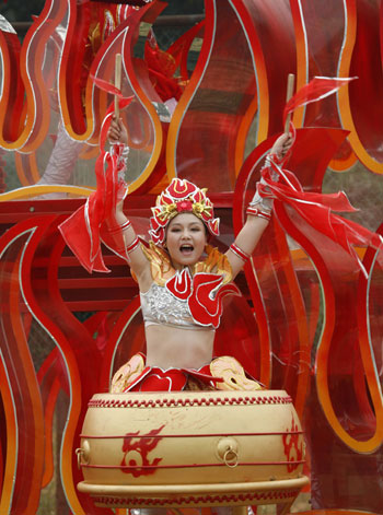 A performer plays a drum during a rehearsal of a show featuring the Olympic mascots in Beijing July 25, 2008. The show is one of the Olympic themed cultural activities and will be performed in the Olympic Green.
