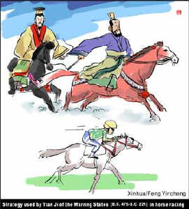General Tian Ji was one of the gamblers always in bad luck. One day he lost the race as usual and went to meet his friend Sun Bin. Sun comforted him and said, "Please sent a message to me before your next race. I'll attend it and perhaps I could do something helpful. "