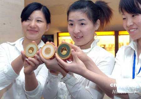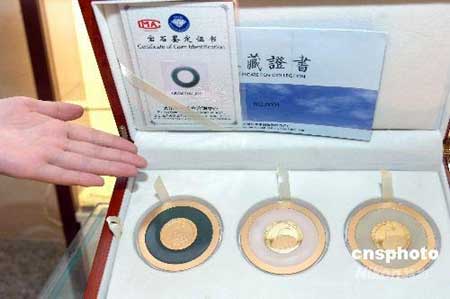 Models display the "Shenzhou-7 souvenir jade medals" at a press conference held at the China Millennium Monument in Beijing on Friday, Sept. 19, 2008. |