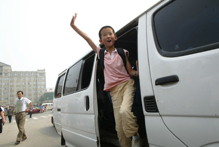 File photo shows ten-year-old Zhang Xinyang got off from a car when he arrived at Tianjin University of Technology and Education on his first day in the university.