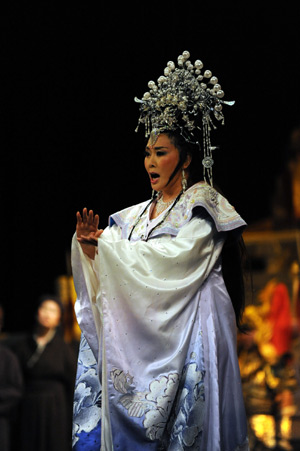 Chinese soprano Wang Xia perfoms her part in the world famous opera Turandot in Cairo Opera House, downtown Cairo, Egypt, on Oct. 27, 2008. The opera, given by China National Opera House, would be performed in Cairo four nights from Oct. 26 to Oct. 29. |