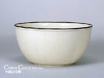 This may appear to be a deep bowl, but the wide area of the base indicates that it is a basin. The lotus design is delicately carved, beveled and combed, to appear faintly against the ivory white surface which is unique to Ding ware. The pot is altered slightly with six vertical lines, making it melon-shaped. The clay is extremely fine, with almost no impurities, making it impossible for this pot to be thrown very thinly, and it is surprisingly light for its size. It did not warp in firing because it was fired upside down, and the glaze on the lip was later grimed. We can see the potter’s masterful touch in the beveled trimming around the base and the thin, low trimming work on the foot.