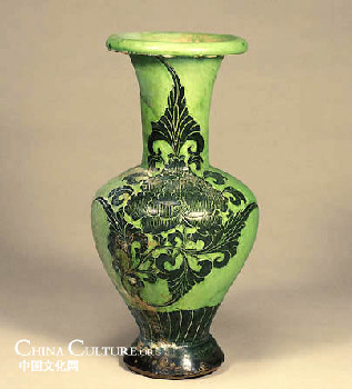 This vase was first formed out of a greyish clay and coated with a white slip. A second coating of iron pigment was applied, then its background was carved away to create a raised pattern. Then the entire vase was coated with a transparent glaze and fired. Up to this point, the vessel was made in the manner typical of Cizhou ware. However, this case is rare in that another coat of green glaze was added and fired again at a low temperature. The particular severity of the peony design that best reflects Northern Song aesthetics, as well as the exceptional size, has made this piece a valuable example noted worldwide.