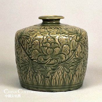 VASE: Stoneware with Sgraffito Decoration of Peony with Transparent Glaze under Green Glaz