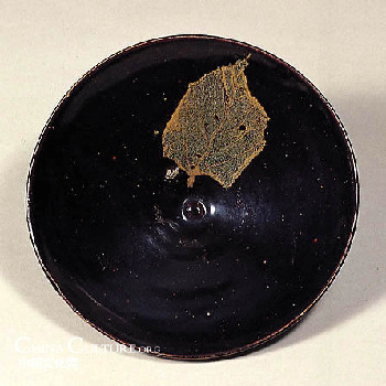 Unlike the tenmoku tea bowl of the Jian ware, the tenmoku tea bowls of Jizhou have thinner walls because of the dense white clay, and have straight sides. The smallness of the foot is also another characteristic of Jizhou ware. Some Jizhou wares are known for the tortoise shell glaze created by coats of yellowish brown and black glazes. This piece shows an application of this glazing technique. However, the technique of actually using a leaf to leave an intricate imprint that even retains the pattern of the veins still remains unexplained.