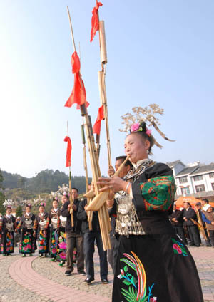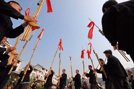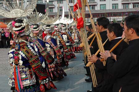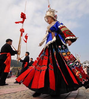 Local villagers perform in the folk dance contest held in Leishan County, southwest China's Guizhou Province, Nov. 11, 2008. |