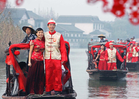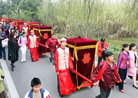 The newly-weds tour during a group wedding of traditional Chinese style in the Shajiabang Scenic Spot in Changshu, east China's Jiangsu Province, Nov. 16, 2008. |