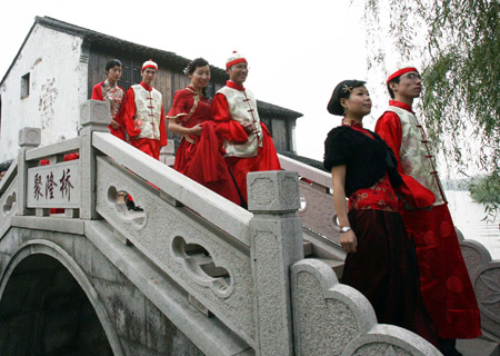 The newly-weds go across a bridge during a group wedding of traditional Chinese style in the Shajiabang Scenic Spot in Changshu, east China's Jiangsu Province, Nov. 16, 2008. |