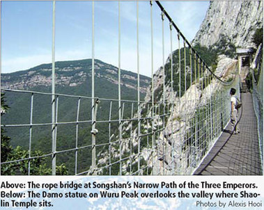Or venture into the adjoining hills west of the temple, where the top of the 750-m-high Wuru Peak is marked by a three-story-tall, white-colored statue of Damo, the patriarch who first taught Shaolin monks martial arts and positioned the temple as the birthplace of Zen Buddhism in China. Close to the top of Wuru lies the cave where Damo sat meditating long enough to apparently leave a shadow on the wall - that slab of the cave is now housed in Shaolin Temple itself.